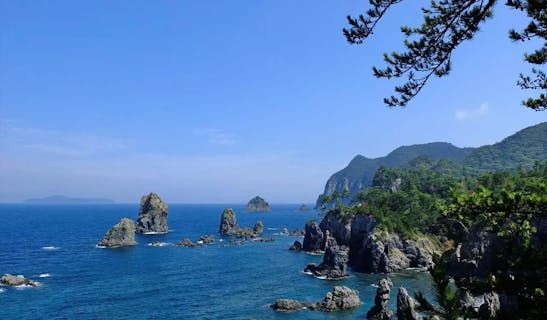 青海島自然研究路は、別名「メモリアルロード」と呼ばれる散策路で、十六羅漢、変装行列、象の鼻などと名付けられた青海島の奇岩群を、歩きながら眼下に眺めることができます。全長1,900mの遊歩道は、随所に植物群落や名勝についての解説板が設置してあり、Aコース1,200m(約40分)、Bコース700m(約20分)の2つの散策コースを選んで楽しむことができます。道は整備されているものの勾配が厳しい箇所もあるので、歩きやすい服装や靴で出かけることと、飲み物の自動販売機や売店がないので持参することをお勧めします。