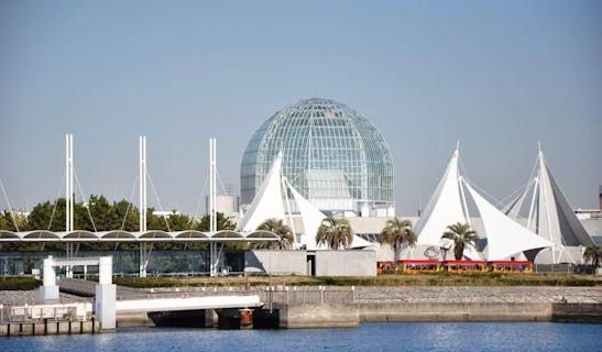 葛西臨海公園を訪れるとまず目につくのが、このユニークなガラスドーム。GINZA SIXなどを設計した建築家・谷口吉生氏の作品で、まるで海の水面を思わせるような、太陽の光をきらきらと反射させる美しいデザインが特徴です。ガラスドームを背に、東京湾のパノラマがひろがるので、記念撮影のスポットとしてもおすすめ!夕方になるとガラスドームがライトアップされ、ロマンチックな雰囲気も味わえますよ。