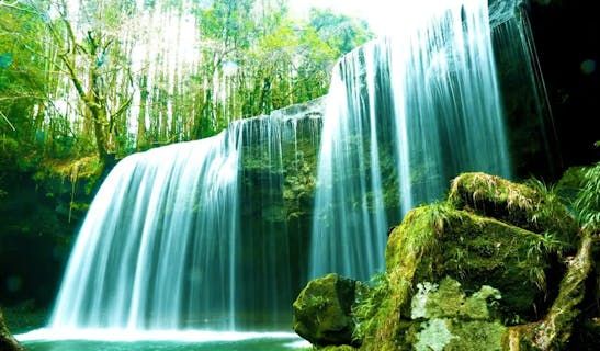 幅広く落ちる水が木漏れ日に照らされ、優美で神秘的な景色が広がる鍋ヶ滝。阿蘇ジオパークの重要な場所のひとつであり、長い年月をかけて現在の形になった滝は、阿蘇の大地の息吹を感じます。マイナスイオンたっぷりで心身ともに癒される自然豊かなスポットです。