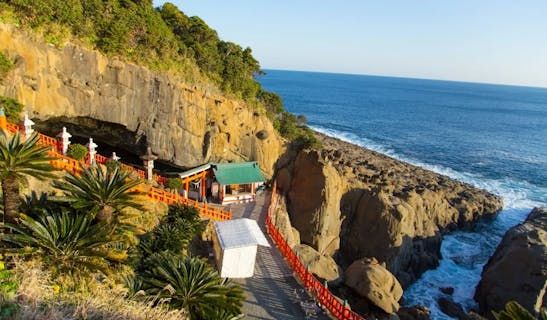 日南市の鵜戸神宮は、洞窟内にある朱塗りの本殿や絶壁から一望できる日向灘の景色が美しい神社です。運玉投げで願いを叶えたり、縁結びや安産などの御利益もあります。また、その地形と神秘的な雰囲気が訪れる人々を引きつけています。