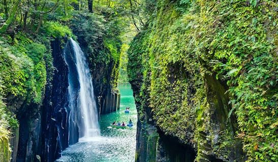 7㎞にも渡って断崖絶壁の渓谷が続く、高千穂峡。中でも17mの高さから勢いよく流れ落ちる「真名井の滝」は圧巻の美しさで、大自然の力強さと壮大なエネルギーを感じることができます。柱状の巨大な岩々が並んでいるように見える周囲の岸壁は「柱状節理」と呼ばれ、遥か昔、阿蘇山が噴火した際に流れ出た溶岩によって作られたとされています。”自然のアート”のような神秘的な光景と、エメラルドグリーンの水、緑豊かな木々、そして大地のパワーに、癒されること間違いなし!