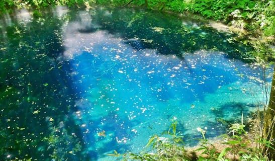 青池の神秘的なブルーが魅力的。大小33の湖沼や手つかずの自然が広がり、歩きやすく案内看板もしっかりと立っている。特に1番人気スポット「青池」は息をのむ美しさで、水面に映し出されるブナの木々や葉、朽ちたブナの大木が時を感じさせます。十二湖ハイキングコースは自然愛好家必見!