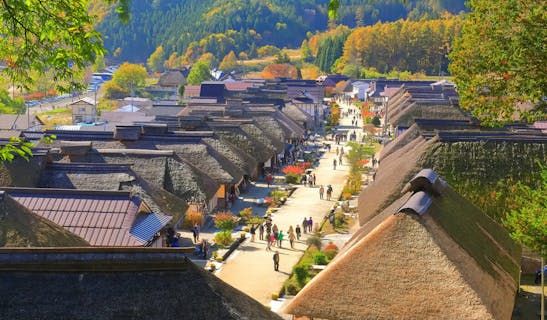 山に囲まれ、茅葺き屋根の民家が両側に立ち並ぶ大内宿の街並み。江戸時代の宿場町の雰囲気が強く残る風景は、まるでタイムスリップしたかのような感覚を与えます。約500mの長さがある"古民家ストリート"で、江戸時代の旅人の気分を味わいましょう。道の両側には、さまざまなお店がありますので、当時の面影を感じながら、グルメやお土産探しをするのもおすすめです。
