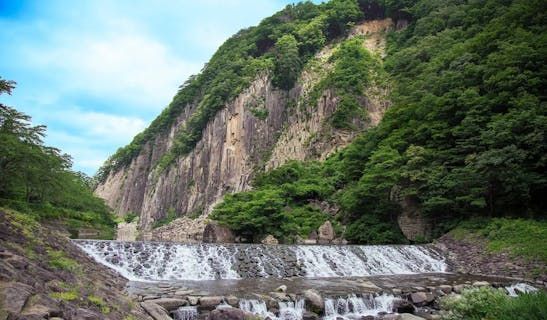 白石川上流の川辺に位置する公園。自然の造形美が見事な「材木岩」が雄大にそびえ、自然を満喫できる憩いの場所です。公園内には水遊びができる噴水もあり、夏は親子連れで賑わいます。